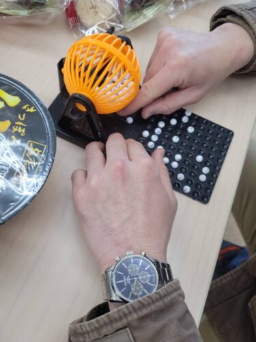 ビンゴ大会では景品を用意し、プリペイドカード、お菓子、インスタント麺などの中から欲しい物を選んでいただきました。