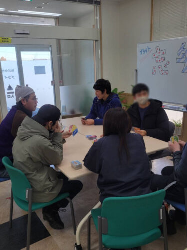 カードゲームではUNOを行いました。UNOは初めてというBさん。CさんがBさんの横で丁寧に説明しています。